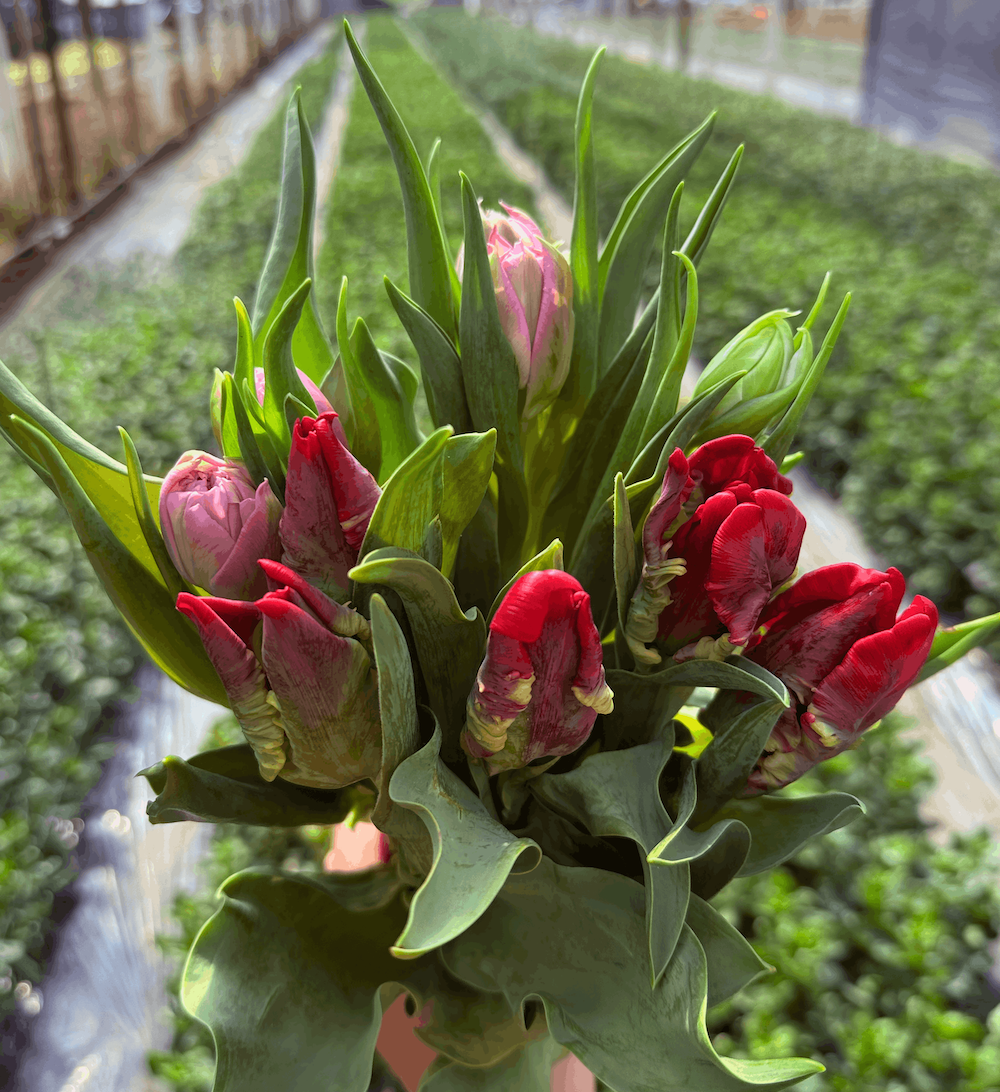 Parrot tulips are a less common variety and more delicate to grow. They do not always behave as neatly as traditional stems. Petals curl. Shapes shift. They open wide and unapologetically. In a retail system that prefers everything straight and standardised, they can sometimes fall outside the brief.